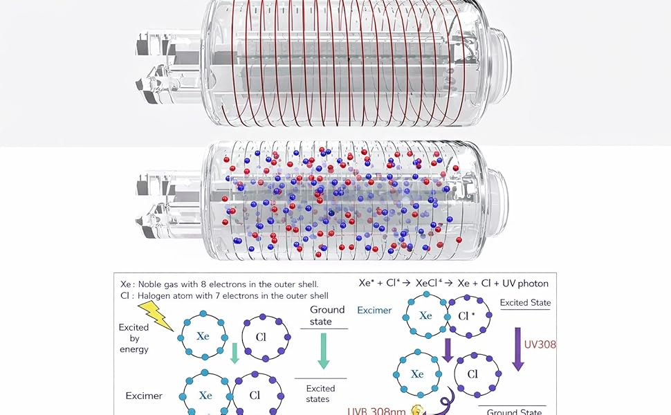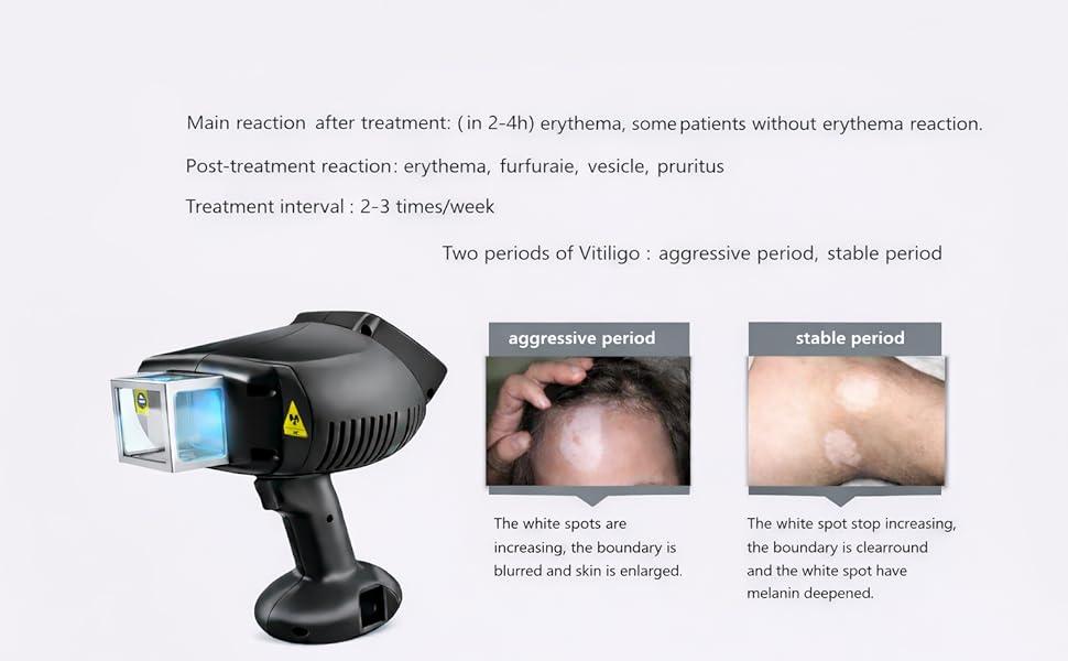 - Targeted Skin Treatment with 308nm UVB Delivers precise narrowband 308nm UVB light therapy to affected areas, helping improve the appearance of vitiligo, psoriasis, eczema, and other skin conditions with focused treatment.
